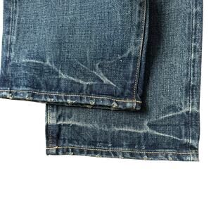 Classic blue straight leg denim jeans with a slightly yellowed “vintage” tone