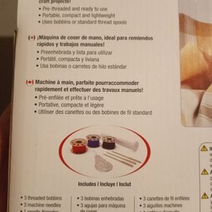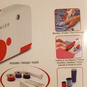 New in box. Never opened. Singer handheld mini mending machine. For quick fixes. Requires 4 AA batteries or AC adaptor not included in the box. Perfect for traveling ,cosplay, conventions anywhere where you may need a quick fix.