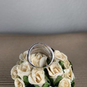 Style is front of ring is laid with CZs alternates with plain silver "strips".