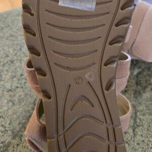 The most comfortable sandles you can have! Sketchers Leather soft suede upper and Memory Foam insoles Sandles with the Sketchers rocker sole. 8M NEW NEVER WORN. Room in the toes and still very light. Tan color.