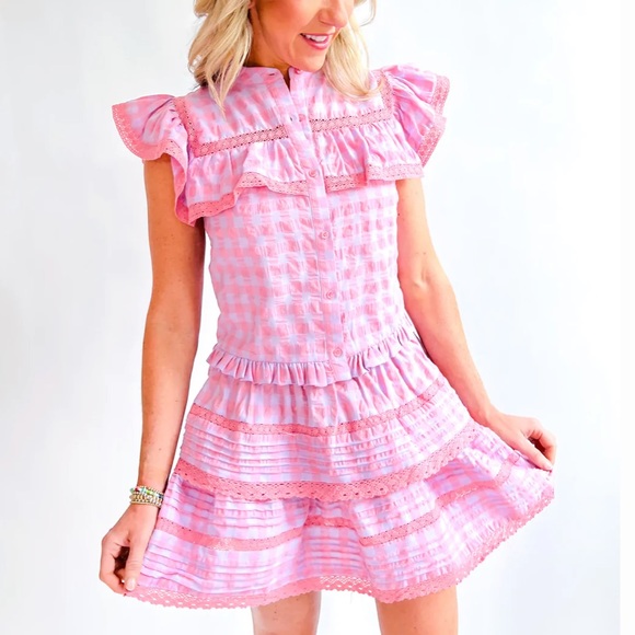 Brand new! Adorable button up lavender and pink gingham top with lace trimmed ruffles.