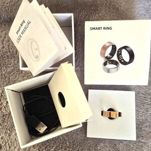 BRAND NEW Un-opened package! Compatible for Apple iOS and Android!! Beautiful, brilliant design with multiple functions such as step/distance/calories burned, blood pressure, Oxygen levels, Heartbeat rates, Weather, Messages notifications, and sleep monitoring. The app is usually SnartHealth, but it is compatible with 3rd party apps so you can use the one you want. Please see pictures of the list of functionality and details. There seems to be optional, additional functions you can add like taking your temperature, but that may be something you need to add. NO subscription needed!! Any app questios please direct to application developers. The ring has an elegant look, very comfortable fit, and much more easier and convenient to wear than a watch! Switch to the ring whenever you want if you have a watch also, like I do. *Ring pictured is mine in Rose Gold. ALL OFFERS CONSIDERED!