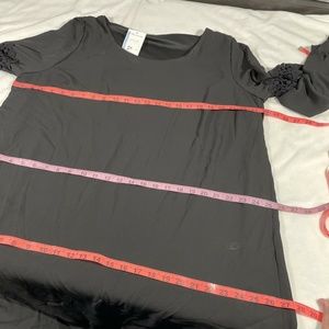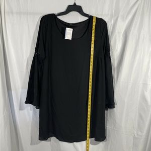 Black dress with bell sleeves and crochet laced detail around the elbow portion. Black lining 100% polyester