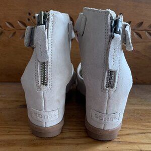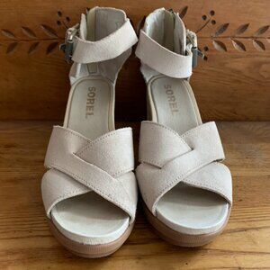 NEW Sorel Joanie II Women's Sandals Suede Ankle Strap Back Zipper Wedge Heel Size 9
