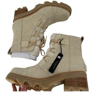 Lug platforms and chunky heels add lift to cozy faux-shearling details in the Joan Now hiker boots from Sorel.