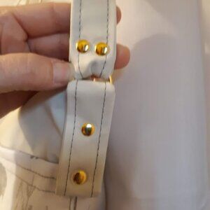 Aluminum rivets and d-ring strap connectors in gold tone
