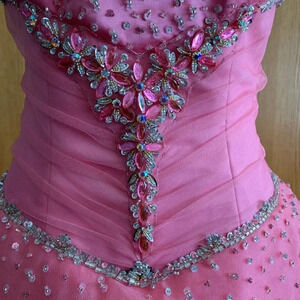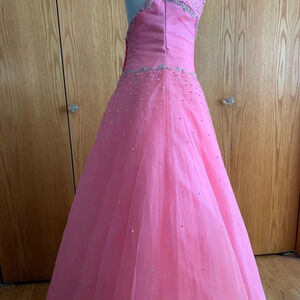 New without tag, pink embellished strapless tulle dress with removable beaded straps included, padded bra, boning for support, back zipper/hook closure, lined, attached is a bag with extra beads, size 10, noticed 2 loose beads and also one side of the eye/hook is missing (see last photos), does not affect closure though, otherwise dress is in great condition