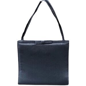 Small satin handbag with iridescent silver shimmer. Cloth lining with bow detail, and snap top close.