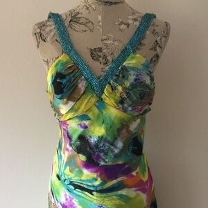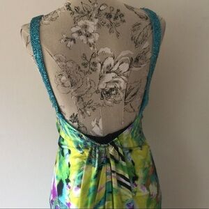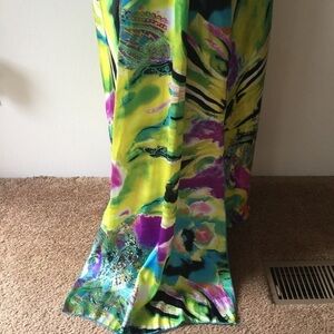 Beautiful colorful dress. Has train on back that flows as you walk. Blue sequin straps and zips on side. Front flat under arm side to side 19". Lined. Down side under arm to bottom leg 46". Train started back center to floor. 100% polyester.