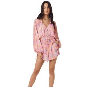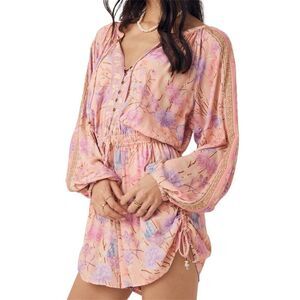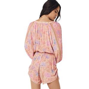 Step into effortless boho style with this gorgeous Spell Butterfly Romper in size medium. Featuring a romantic floral print in soft peach, lilac, and golden tones, this lightweight romper includes flowy long sleeves, a flattering button-down front, and a comfy elastic drawstring waist. Easy to dress up or down for sunny days, beach trips, or festival fun.