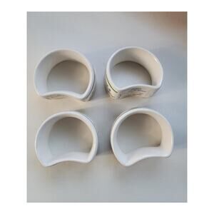 Add a touch of elegance to your holiday table with this set of four Spode Christmas Tree napkin rings. These beautiful napkin rings are in white, green and gold. They are crafted from high-quality porcelain and feature a classic Christmas tree design accented with 22K gold. Perfect for adding a festive touch to your holiday meals. These are new in box from smoke/pet-free environment!