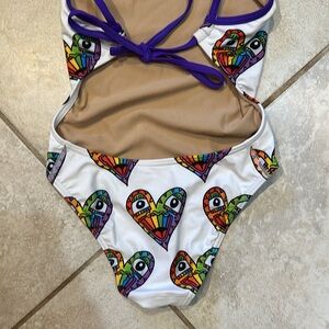 Brand new without tags Sporti x Tyler Wallach Hydrolast Competition Racing One Piece Swimsuit women's size x-small. White with Tyler Wallach rainbow heart print all over, purple trim, straps cross in back, adjustable ties, low back, full coverage rear, fully lined. Offers accepted!