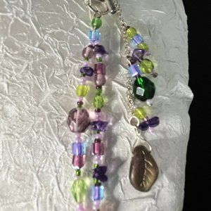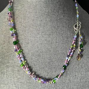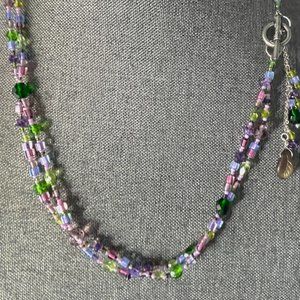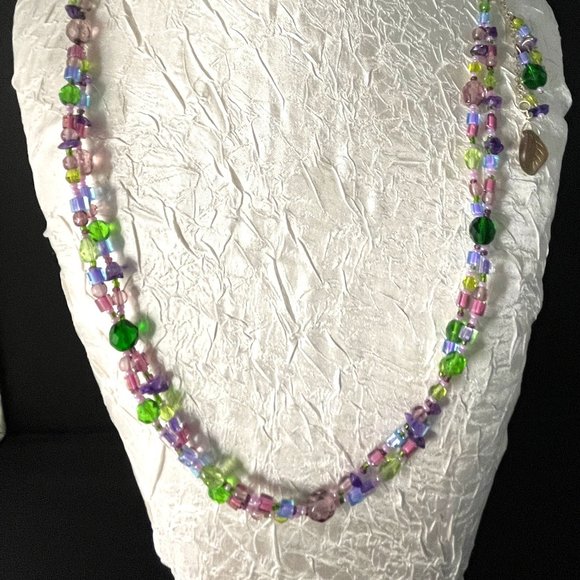 NEW Handmade springtime necklace made of various shades of green beads, pink beads, blue and purple beads, various shades of seed beads, a silver chain tassel with a large purple leaf and it has 2 strands. The closure is a silver-plated pewter toggle clasp. This necklace has a vintage retro BOHO look. It measures 24" long.