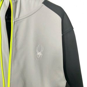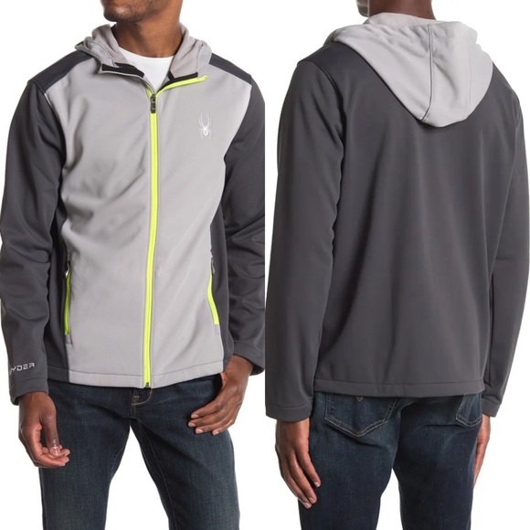 This Spyder Softshell Jacket features raglan colorblock gray sleeves and contrasting neon zippers. Embroidered Spyder logo on chest. Attached hood. Zippers pockets. Breathable and waterproof HydroWeb material. Brand new with tag.