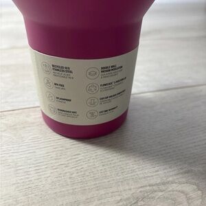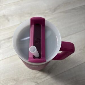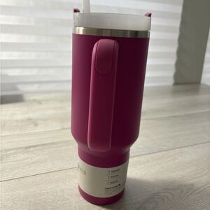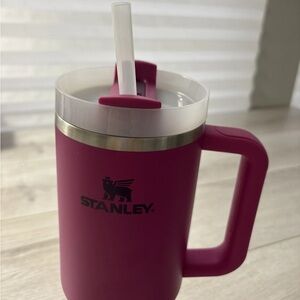 Sleek Stanley tumbler in vibrant magenta. Keeps drinks hot or cold. Perfect for any occasion.