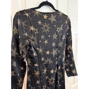 Celestial elegance takes center stage with this enchanting star print maxi Duster. Imagine yourself gliding through a sophisticated cocktail party or a romantic evening dinner, the deep V-neck adding a touch of allure while the flowing silhouette ensures effortless movement. Featuring a mesmerizing star pattern in shimmering metallic hues against a classic black backdrop, capturing the light with every turn. Long sleeves provide a comfortable yet refined look, making it perfect for cooler evenings or more formal occasions.