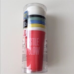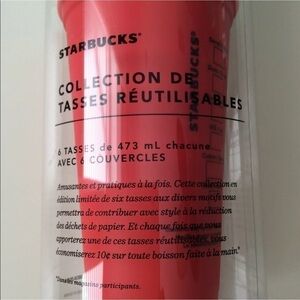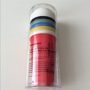 NEW with tags - Starbucks Reusable Cup Set - 6 different color, plastic cups with white, snap-on lids; each cup has a different slogan.