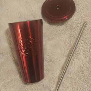 NEW Starbucks Rare 2014 Red Metallic Stainless Steel Cold/Hot Tumbler includes metal straw