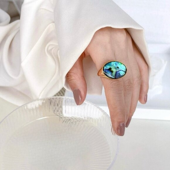 This Striking Cocktail Ring adorned with oval iridescent abalone seashell.