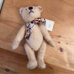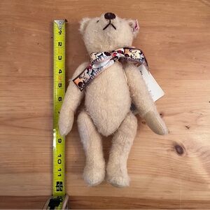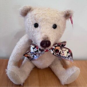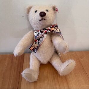 Fritzle is an 11" mohair bear released in 2015. Limited to 1,880 pieces this 5-way jointed friend is wearing a big bow printed with a variety of Steiff advertising designs.