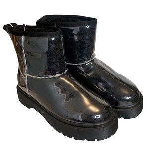 NEW Steve Madden Black Ankle Boot Faux Sherpa Ugg Style in Clear Gloss Size 7.5