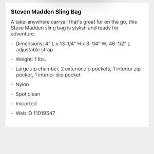 NEW with tags Steve Madden blue sling bag. Adjustable strap. See photo for more info