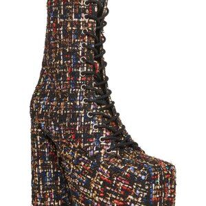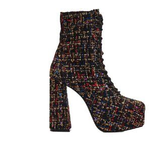 A dynamic, exaggerated boot silhouette with lacing at the front showcases uniquely textured black/multi tweed-like fabric.