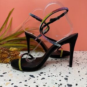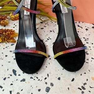 NEW Steve Madden Festive Rainbow Rhinestone Women’s Heeled Black Sandals Sz 8