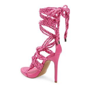 Rope-like laces are knotted and wrapped around the ankle to bring sporty appeal to a sultry sandal perched atop a soaring stiletto heel.