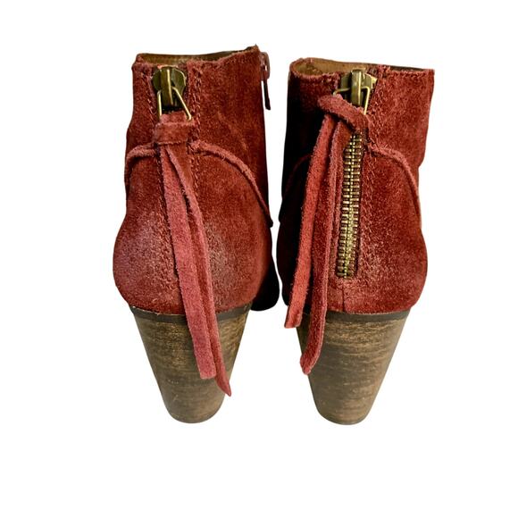 New, genuine suede. Step out in style with these brand new Steve Madden Milaan ankle boots! These stunning boots feature a rich slightly distressed merlot suede, adding a touch of luxury to any outfit. Cushioned footbed, decorative zip with fringe in back, functional zipper inside ankle. The 2.75 block heel provides both height and stability, making them perfect for all-day wear.
