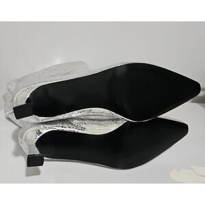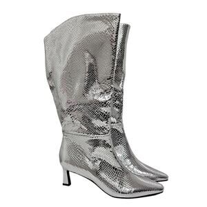 Striking and stylish, these Steve Madden boots feature a bold metallic silver finish with a textured snakeskin-inspired pattern. Designed with a true wide-calf fit for added comfort, they offer a sleek pointed toe and a low, easy-to-wear heel. Perfect for nights out, concerts, holiday parties, or adding a statement piece to any outfit.
