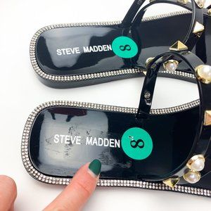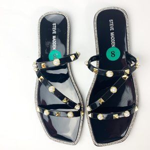 NEW Steve Madden jellah black gold stud and pearl detail square toe sandal in size 8. Light sticker residue on back end of footbed. Rhinestone edge detail
