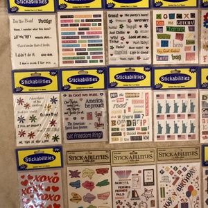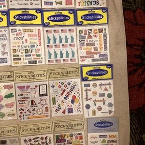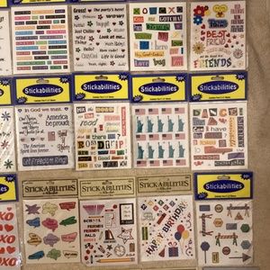 Here’s a HUGE LOT of BRAND NEW, NEVER OPENED, stickers by Stickabilities. There are 24 packages in this lot. Each package has 2 sheets of stickers! There are no repeat packages, each one is different! The copyright date on all packages is 2003. This lot is perfect for the scrapbook person!