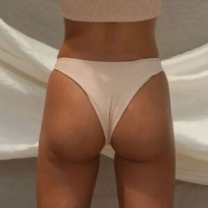 Beige “biscotti” high cut bottoms in a fun textured pique swim fabric