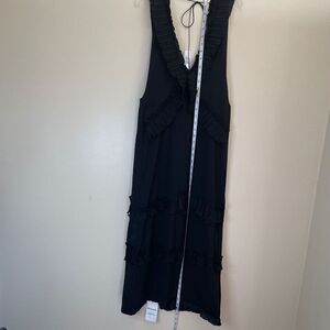 Storets, ruffled black maxi, has Spanish salsa vibe with back slit, and tie around back neckline, very unique classic maxi. comfortable quality material cotton/spandex mix. Excellent quality!