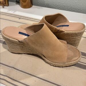 Chic espadrille wedges by Stuart Weitzman. Beige suede upper. Comfortable and stylish for any outing.