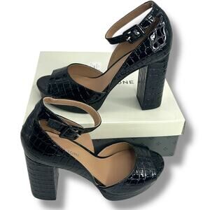 NEW Sun + Stone Black Patent Mock Croc Platform Heels Size 9.5 Ankle Strap Peep