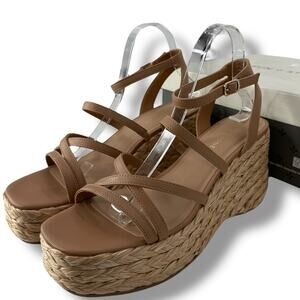 NEW Sun + Stone Brown Strappy Espadrille Wedges Size 9.5 Rattan NIB