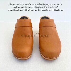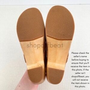 - Slip on, block heel, wood heel, rubber sole, leather upper