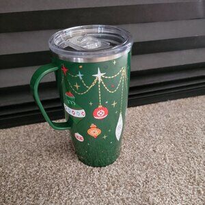 "Deck the Halls" print Swig life 22oz travel mug. Stainless steel interior. Only used once. All sales final, no returns. Smoke free home. Measures: 7.75” H x 3.5” W (lid included). Base: 2.7” in diameter. Weighs: 0.8lb when empty