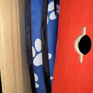 Brand new and imperfect condition. Was completely sealed. I broke all three pieces of tape so I can take an interior picture. would make a great gift. For dogs up to 65 pounds. 27 inch length and 48 inch height when expanded and inflated.