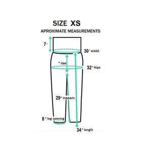 Size XS Length 34 in - Inseam 29 in - Waist 30 in - Hips 32 in - Leg opening 8 in - Waist to up 7 in