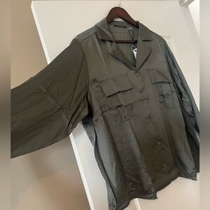 NWT brand new! T Tahari forever olive polyester & viscose blend fabric blouse. Soft, satin and flowy. Long sleeve. Front open pockets. Button down. “Airflow” boxy camp blouse. Gorgeous sleek texture. Wrinkled from being folded. Measurements in photos. Women’s size 3X. Smoke free home