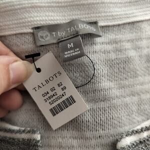 New with tags T by Talbots Tunic top. Grey and white texture stripes. V-notch neckline. White trim detail around wrists and waist. Size Medium.