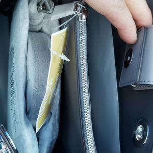 silver-tone exterior hardware; 2 side slip pockets; signature plaque at front; removable logo charm