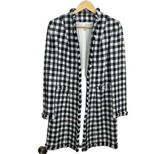 NEW TAHARI Gingham Long Coat Clasp Closed Boucle Tweed Plaid Fringe Jacket Black/White 6P