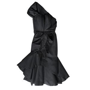 New with Tag Tarik Ediz Couture "Merla" Ruffle Skirt One Shoulder Midi Dress In Black Taffeta MSRP $750
