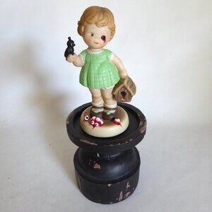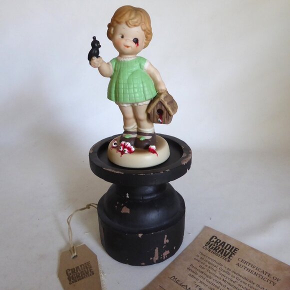 New, never displayed, Cradle to Grave Curiosities, “Perilous Moments” series, upcycled, gothic, one-of-a-kind, horror bisque porcelain oddity figurine. It is entitled “Melanie / Tippi”. Depicting the actress Tippi Hedren in her famous “The Birds” character, Melanie, in the 1963 Alfred Hitchcock classic horror film. “Melanie" has her eye pecked out by a black bird. As she holds a bloody bird house with a pile of bloody eyeballs at her feet. Comes with wood display base.