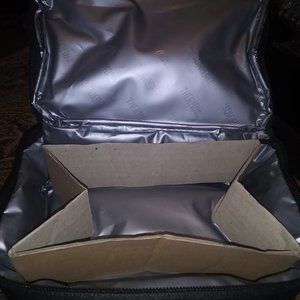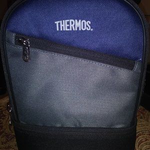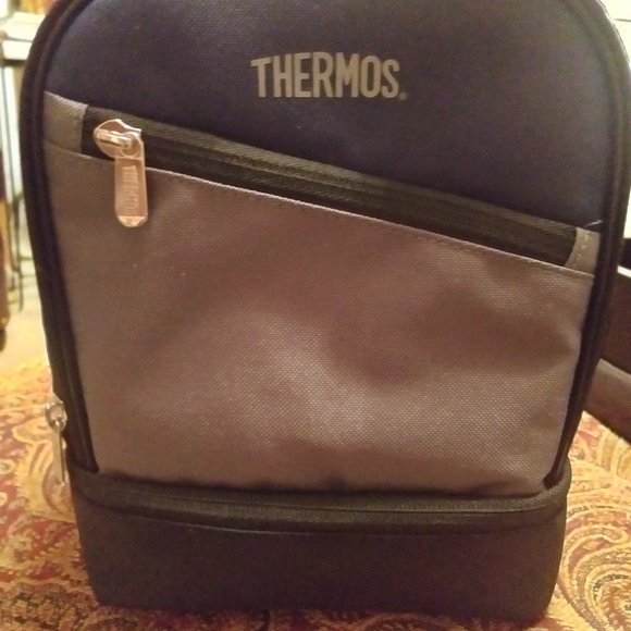 NEW colors on bag Blue/grey/black Thermos Lunch bag for unisex-size(9 1/2 x 7 1/2 x 5 width handle on top of bag- no straps-can be used for trips, work etc. Canvas material on outside-PLEASE LOOK AT PHOTOS THANKS
