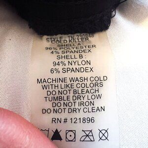 96% poly/4% spandex with DWR; 94% nylon/6% spandex